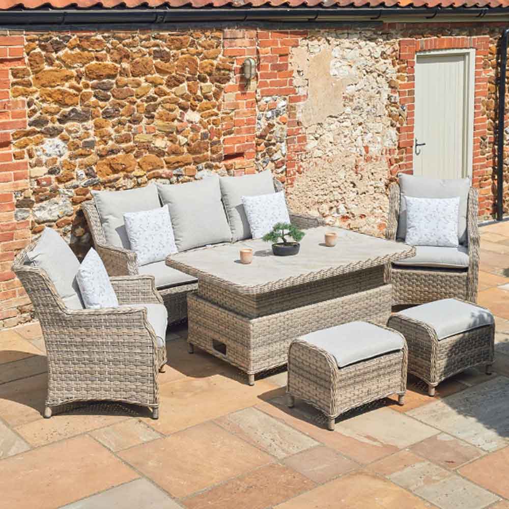 Transform your garden into a stylish and versatile relaxation space with the Furniture in Fashion Fresno Rattan Outdoor Lounger Set with Adjustable Table in Brown and Wheat. Designed for both lounging and outdoor dining, this elegant furniture set combines timeless woven aesthetics with modern functionality, making it perfect for entertaining guests or enjoying relaxed outdoor moments with family. Expertly crafted with handwoven multi-toned poly-rattan and a durable powder-coated lightweight frame, this lounger set delivers long-lasting outdoor performance with minimal maintenance. The adjustable table height allows effortless transition between a coffee table and dining table, while season-proof cushions made using environmentally friendly Eco Core materials ensure superior comfort and weather resistance throughout the seasons. FEATURES: Material: Rattan, Fabric, Glass Finish: Brown, Wheat Set Included: 1 x 3 Seater Sofa, 2 x 1 Seater Sofa, 2 x Stool, 1 x Table Stylish rattan outdoor lounger and dining set ideal for patios, gardens, and terraces Adjustable height table easily converts from lounge to dining position Handwoven multi-toned hook poly-rattan with authentic wicker effect Decorative twisted rod weave trim adds premium design detailing Durable powder-coated lightweight aluminium frame for strength and stability Comfortable season-proof cushions designed for outdoor durability Cushions feature stain-resistant and UV-resistant fabric for easy maintenance Made with environmentally friendly Eco Core materials for sustainable comfort Strengthened ceramic-coated safety glass tabletop for durability and easy cleaning Available at an affordable price Images shown are for illustrative purposes only CHAIR DIMENSIONS: Height: 90cm Width: 71cm Depth: 85cm STOOL DIMENSIONS: Height: 34cm Width: 41cm Depth: 41cm TABLE DIMENSIONS: Height: 48/68cm Width: 155cm Depth: 95cm