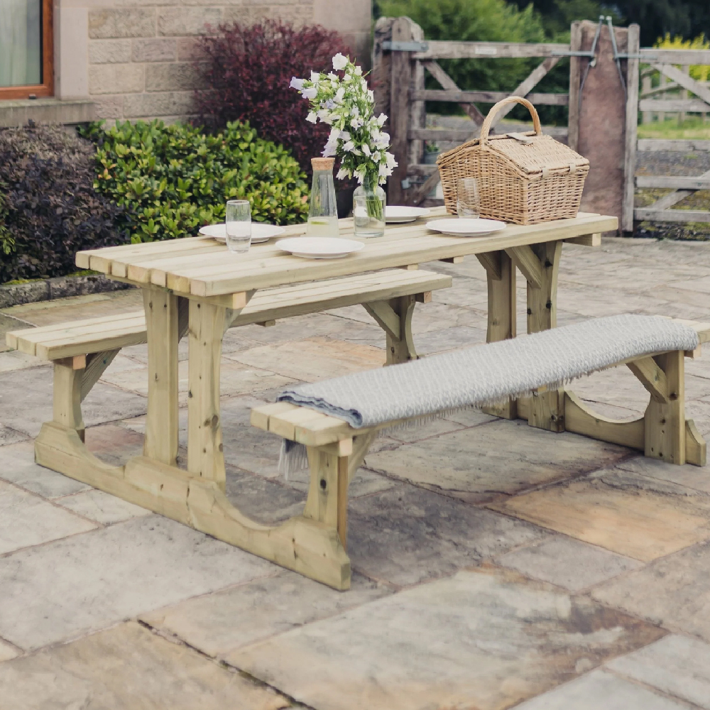 Enjoy outdoor dining in style with the Furniture in Fashion Ledyard Large Wooden Picnic Dining Set In Natural. This beautifully crafted set is designed to bring comfort and functionality to your garden, patio, or balcony. Featuring a sturdy wooden table with matching benches, it provides a cozy and inviting space for family meals, picnics, or casual gatherings. The natural wood finish enhances its rustic charm, making it a timeless addition to any outdoor setting. Built from high-quality, weather-resistant wood, the Ledyard Large Wooden Picnic Dining Set offers durability and stability for long-lasting use. Its compact design makes it ideal for Larger outdoor spaces while still providing ample seating for an enjoyable dining experience. Whether you’re sipping morning coffee, hosting a summer barbecue, or relaxing with loved ones, this versatile set is the perfect choice for any outdoor occasion. Enhance your outdoor dining experience with the Furniture in Fashion Ledyard Large Wooden Picnic Dining Set In Natural, a stylish and practical addition to any garden or patio. FEATURES : Material : FSC Certified Wood Finish : Natural The Ledyard Walk-In Picnic Table is beautifully designed with half-moon walk in floor panels to make it practical yet aesthetically pleasing A design that will look wonderful in any outdoor space including gardens, restaurants, parks, schools, and pubs, it combines timeless style with reliable functionality Built for durability, this table is heavy duty, 1500MM in length and features a 50mm parasol hole Made from premium, pressure treated FSC certified timber to resist rot for up to 20 years with proper care And are the perfect accessories to any other piece in the furniture range, team them to give your garden a beautifully co-ordinated finish Solid and sustainable Swedish Redwood Pressure treated timber No painting necessary Seats up to 6 Premium Wooden Construction Made from durable, high-quality wood for strength a