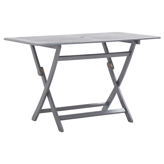 Enjoy a nice meal outdoors with your family and friends around our garden table! The wooden table will bring a touch of rustic charm to your patio, garden or terrace. FEATURES : Material : Acacia Hardwood Finish : Grey Wash The outdoor dining table is made of solid acacia wood, a tropical hardwood, which is weather-resistant and highly durable It features a hole for holding a parasol firmly in the middle. The outdoor table can be folded away to save space when not in use The dining table needs assembly Foldable table Available at an affordable price Images shown are for illustration purpose only DIMENSIONS : Height : 75cm Width : 120cm Depth : 70cm